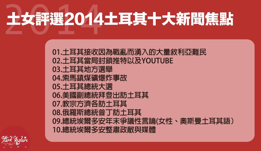 自2014年初土耳其受封「薄荷四國」開始,一整年下來無數次搶進國際新聞版面。年中萬年總理埃爾多安(Recep Tayyip Erdoğan)如眾人預料選上新任總統,在他充滿爭議性的領導下,聲勢不斷看漲的土耳其又將如何迎接新的一年?