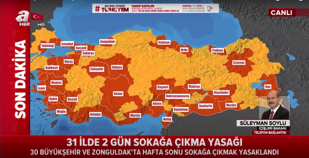 除了對於未成年、老人頒布「禁足令」限制行動自由,土耳其內政部週五突然宣布全國31個省份進行48小時的「宵禁」。