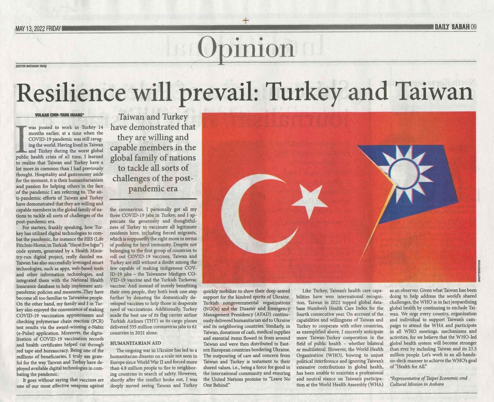 土耳其🇹🇷英文大報「每日晨報」( DAILY SABAH)刊出黃志揚代表投書標題為Resilience will prevail: Turkey and Taiwan