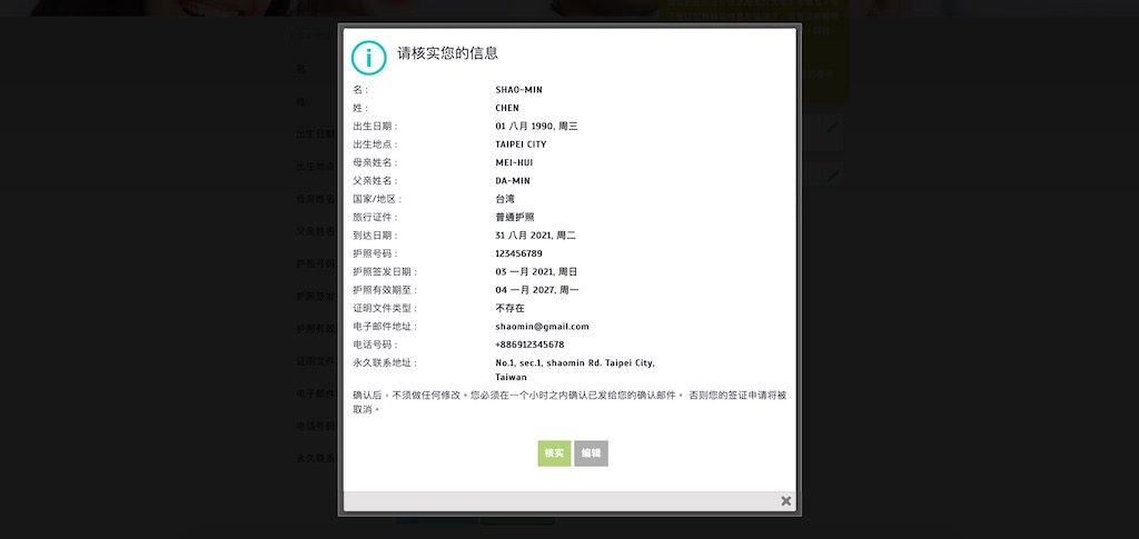 6.畫面自動跳出所填寫的個人資料確認欄,請再次核對檢查,沒有問題後按下「Verify(核實)」送出資料。*上面的資料是為了範例亂填的請不要當真。