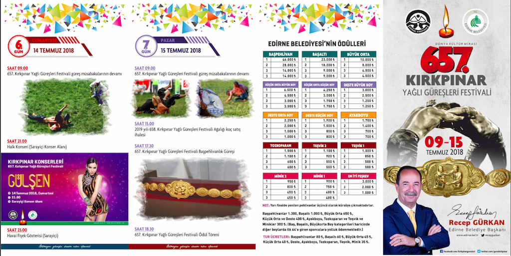 克尔克普那尔摔跤节会举办三天,不只是比赛,在市区内也会有相关的活动,像是会请歌手来演唱、放烟火等等,而这里的冠军是可以名留青史,几乎可以说是全土耳其最厉害的油脂摔跤手。