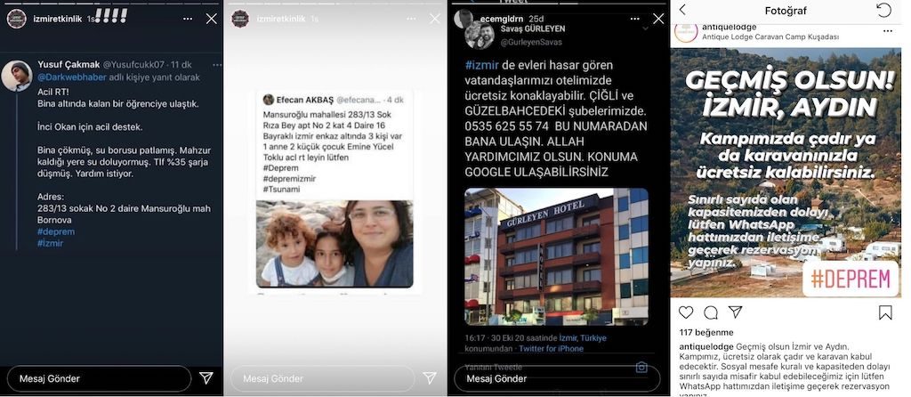 自地震发生后,在各大社群网站,像是Instagram、推特等出现大量转发的救难资讯,有些受困瓦砾堆的人利用仅剩的手机电力与能收到的讯号发出求救讯息,留下自己的姓名和所在位置,试图利用社群的力量自救。同时,伊兹密尔省的饭店业者以及露营业者自发性地提供给灾民免费住宿和餐食服务,只要透过电话或是讯息联络,就能协助安排栖身之处。物流业者帮忙运送干粮还有毛毯,民间的互助很给力。根据相关单位回应,目前土耳其救灾资源尚能自足,感谢各界的关心。