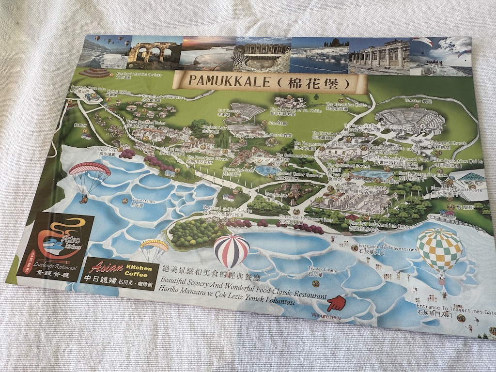 棉堡區域實際上是跟旁邊的希臘古城「希拉波利斯(Hierapolis)」一起的,所以實際上去的景點是叫作「希拉波利斯(棉堡)考古遺址(Hierapolis (Pamukkale) Arkeoloji Örenyeri)」,不要誤會了,所以要去棉堡景區一定要進古城的意思,裏面還有一個室內的考古博物館。共有兩個主要入口,多數人會前往、比較靠近棉堡區的是山坡上的「南門(South Gate)」,另一個則是在平地,接近古城墓區的「北門(North Gate)」,提供在棉堡的「Asian Kitchen Cafe」餐廳照下的中文版地圖參考。
