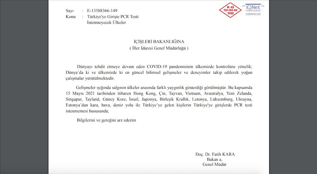 根據土耳其公共衞生總局函知土耳其旅行社協會(TÜRSAB)、土耳其航空的公文,自5月15日起,共有16個國家入境土耳其的旅客不必檢附新冠肺炎核酸檢驗(PCR)報告。共計有香港、中國、台灣、越南、澳洲、新西蘭、新加坡、泰國、韓國、以色列、日本、英國、拉脫維亞、盧森堡、烏克蘭、愛沙尼亞的旅客。