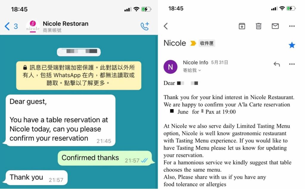 這次是大約三週前訂位,2022年6月用餐,從google map上連結到訂位系統(quandoo.com.tr)先填單,而不是從官網直接聯絡,所以一開始還有點怕怕的,不過送出之後過了大概不到24小時,就收到 Nicole 經理寄來的確認email。內容是英文,前面是確認預訂用餐的日期時間,另外介紹菜單與用餐注意事項、服裝,了解飲食禁忌。在當天,whatsapp收到「Nicole Restoran」(沒有拼錯,是土耳其文)商業帳號的訊息,提醒預約,另外如果會遲到,中間也可以直接用訊息告知他們臨時狀況,總之,因為這些確認步驟讓人比較有安全感。