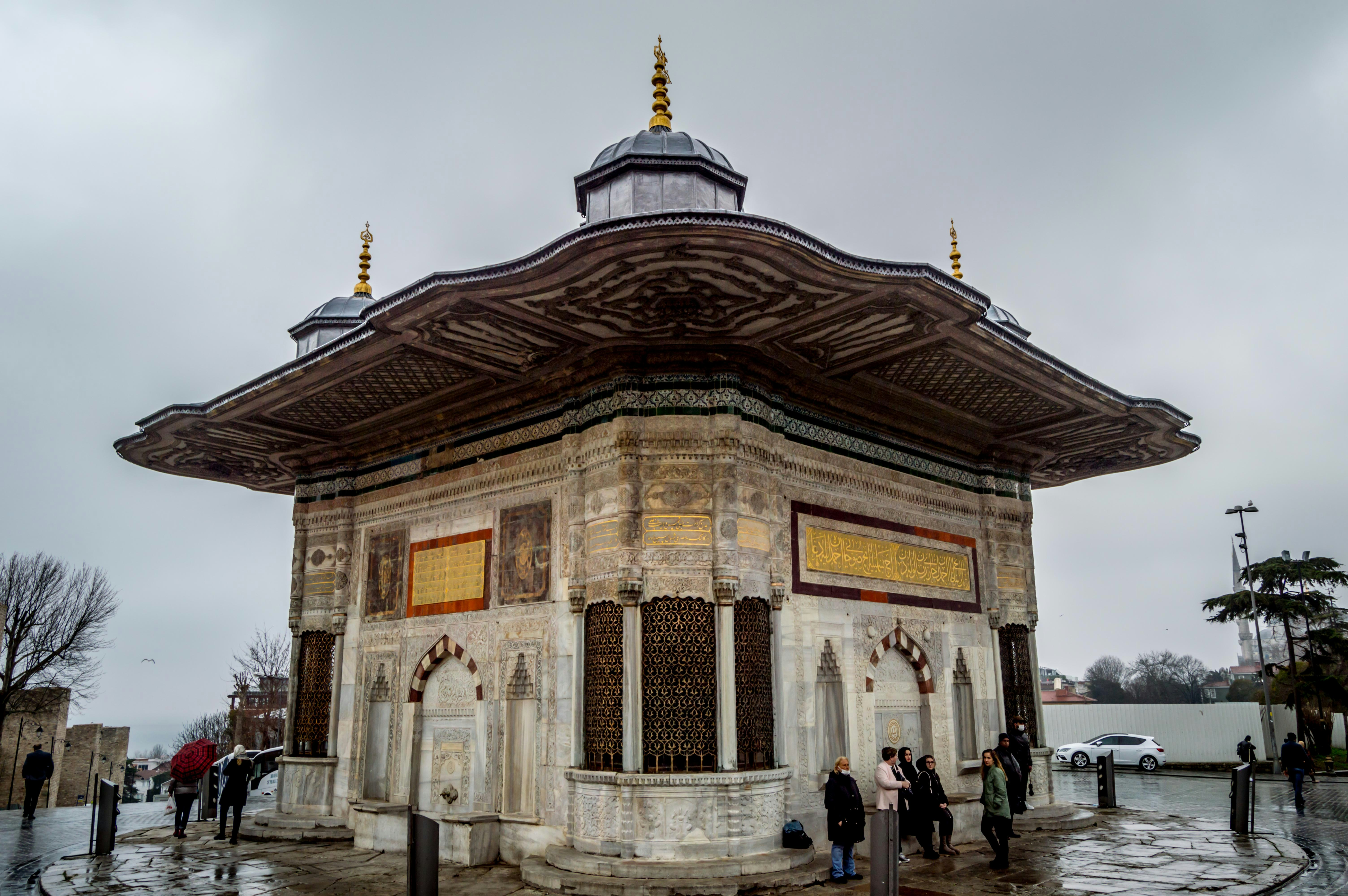 還沒進門前的右側,有一處精美的小建築是「艾哈邁德三世噴泉(III. Ahmet Çeşmesi)」,許多人會太急着進宮略過,但其實它也很值得停下腳步一看。這座噴泉不是想像中的許願池款式噴泉,是一間小屋形式,四周有讓穆斯林淨身的洗手台。