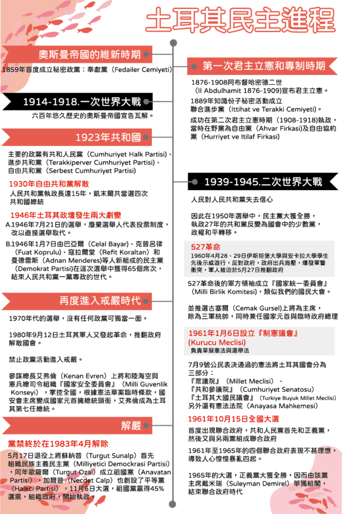 讀完之後是不是覺得和我們的民主進程很相近呢?至於現在土耳其的執政黨則是正義發展黨,是在2001年成立的新政黨,也許下週可以來介紹一下唷!民主不是一件簡單的事情,民主程度也雖然有自由之家的標準作為衡量,土耳其在那樣的規章下也許不是高度自由的國家,但其實相比之下,我覺得差異性較高的可能是新聞自由,政治上他們也會有暴動遊行等等的舉動,總之希望能讓大家也看到土耳其民主的進程,進而瞭解民主從來不是唾手可得的事情,有時候改變現狀是困難的,但是我們該做的應該是思考現在放眼未來,究竟怎樣才是對國家與世代更好的選擇,香港加油,台灣加油。
