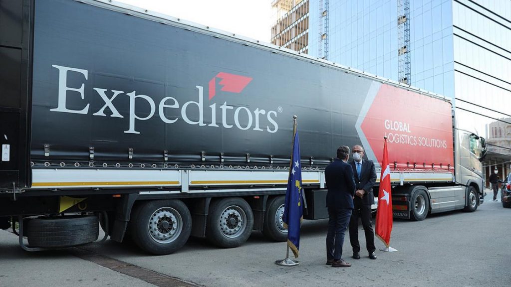 嵌入自TRT与品牌报导照片:土耳其与科索沃官员于物流业者的仓库前合办记者会交接防疫物资