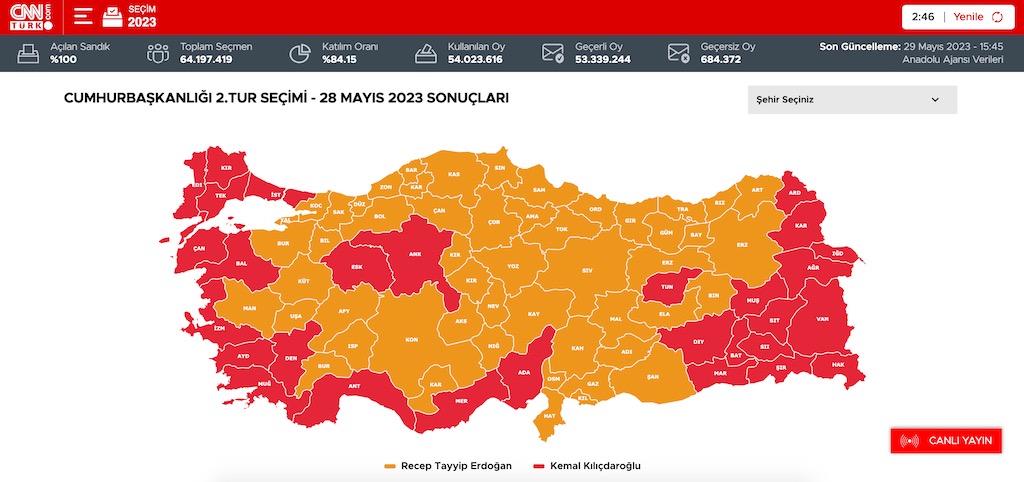二轮投票结果埃尔多安52.18%(橘黄色)对基里达欧鲁47.82%(红色),大致上省份都没有太大变化,唯一整个改变的是在叙利亚边境的“哈泰伊省(Hatay)”