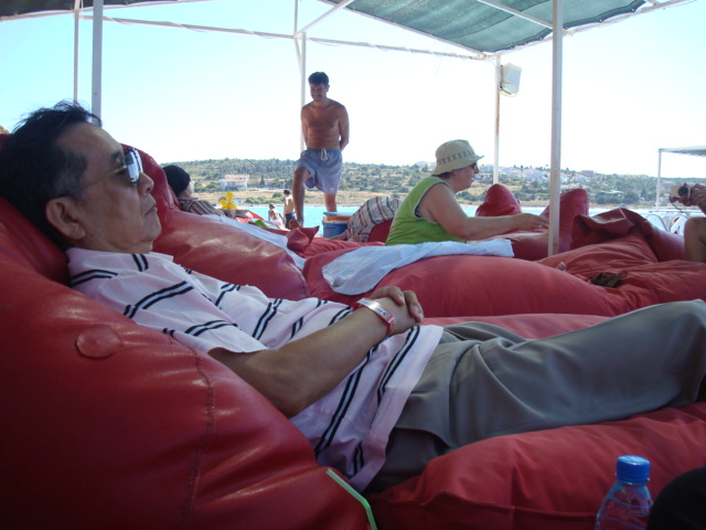 近看才晃然大悟,是的~这里没有平常常见的鲤鱼形状饲料贩卖机,这些小亭子里坐的正是贩售盘装饲料的小贩,圣鱼当然不能没被豢养,这些远道而来的旅客/信徒们,每个见到成群的鲤鱼一涌而上,每个都笑得嘴合不拢,有个身型丰腴的土阿姨还跟我分享了手上的饲料盘,邀请我一起喂食这些“传说中由煤炭变来的”神圣之鱼;道别时阿姨还特别又强调了一次:“牠们是守护者,千万不可以吃喔!”