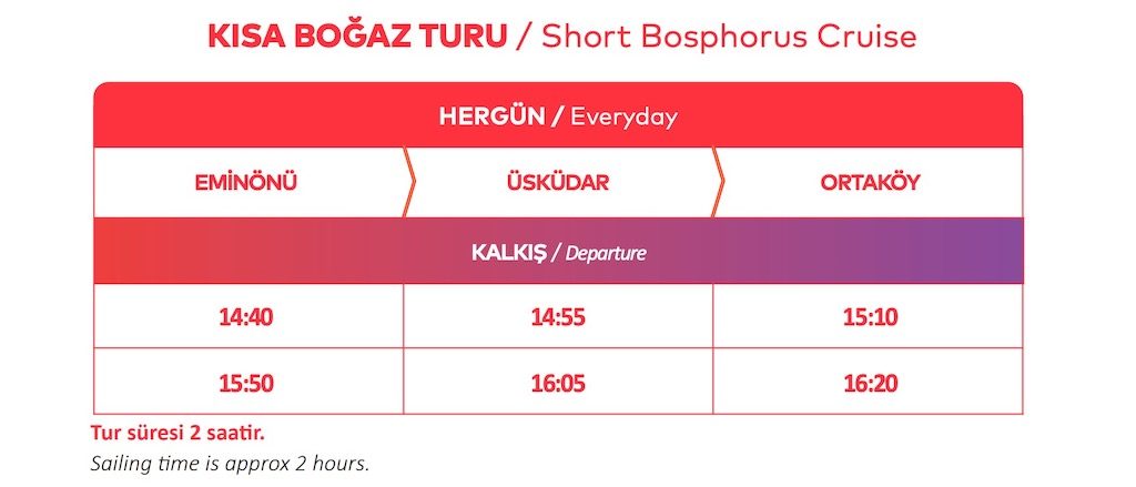 短線(KISA BOĞAZ TURU):每天行駛,出發點不停靠下船,全程約2小時。2022年公營船是32TL,12歲以下半價。