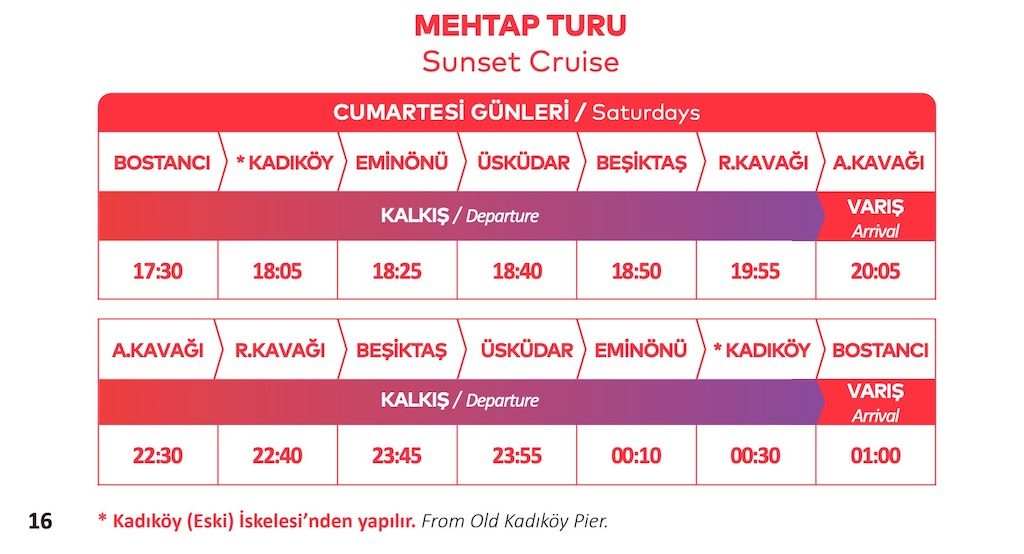 日落線(MEHTAP TURU):只有週六行駛,上船站有點不同,從亞洲岸港口出發,卡德科伊是舊港口,與長程線相同最終會到近黑海小鎮停留,在午夜返抵市區港口。2022年公營船是52TL。
