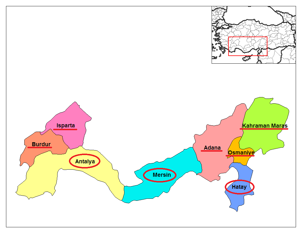 圖中圈起來是土耳其地中海地區橄欖主要生產地,Antalya、Mersin、Hatay。