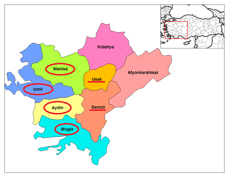 圖中圈起來為愛琴海地區主要橄欖生產地,左上角為主要對外出口地伊茲密爾(İzmir)。