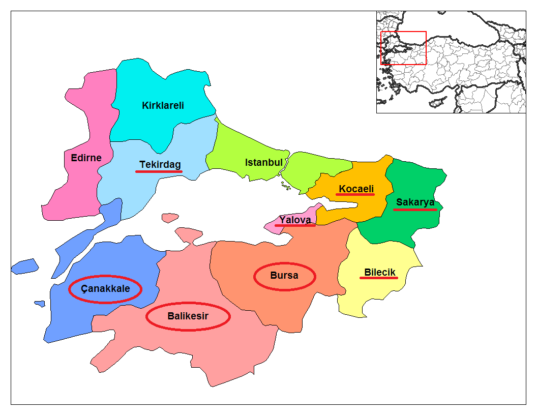圖中圈起來為馬爾瑪拉地區主要橄欖生產地,Çanakkale、Balikesir、Busra。