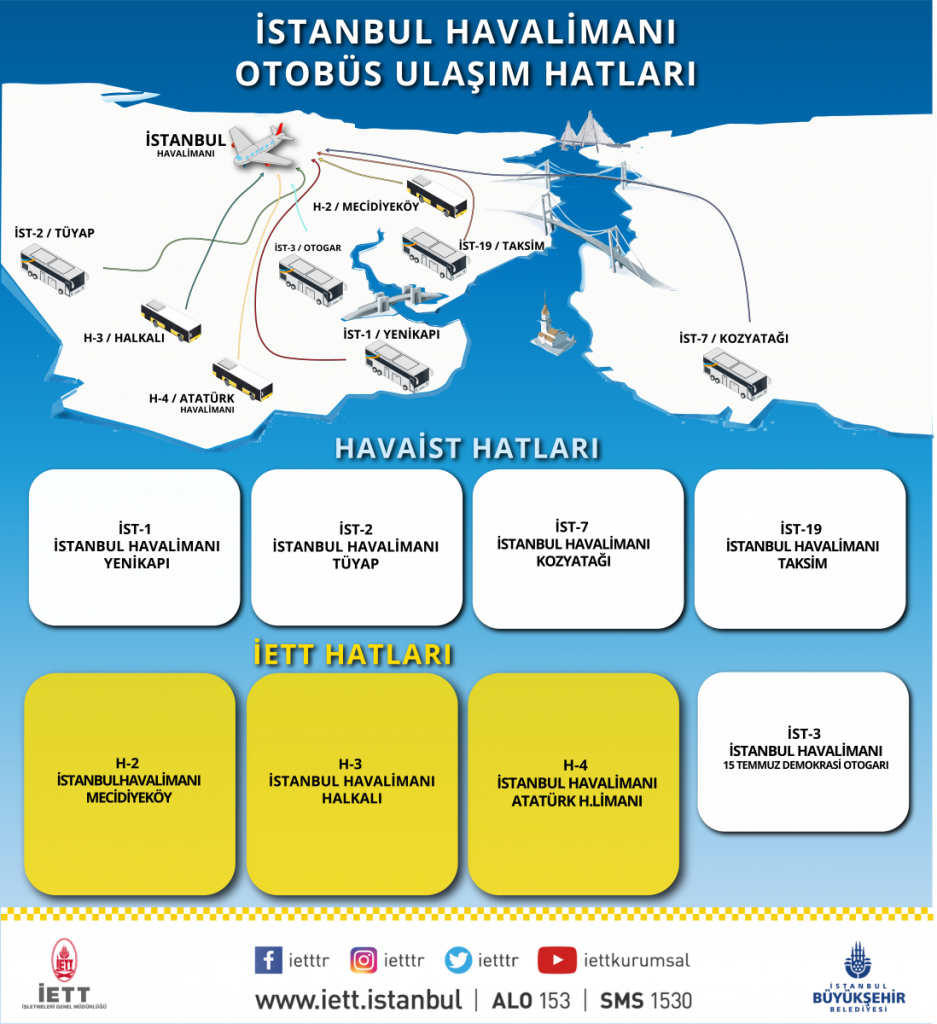 - 客運總站線İST-3(總路程約90分鐘):15 TEMMUZ DEMOKRASİ(ESENLER) OTOGARI-ALİBEYKÖY CEP OTOGARI-İSTANBUL HAVALİMANI HATTI
