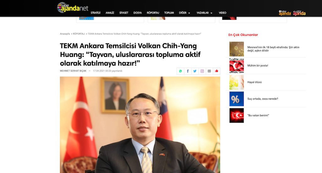 駐土耳其代表處黃代表接受土耳其政論雜誌《新聞時事(Haber Ajanda Dergisi)》專訪,以2020年幾件不同領域的台灣焦點,說明台灣在國際上的立場與努力目標,代表強調「德不孤必有鄰」,將繼續為台灣在土耳其發聲。