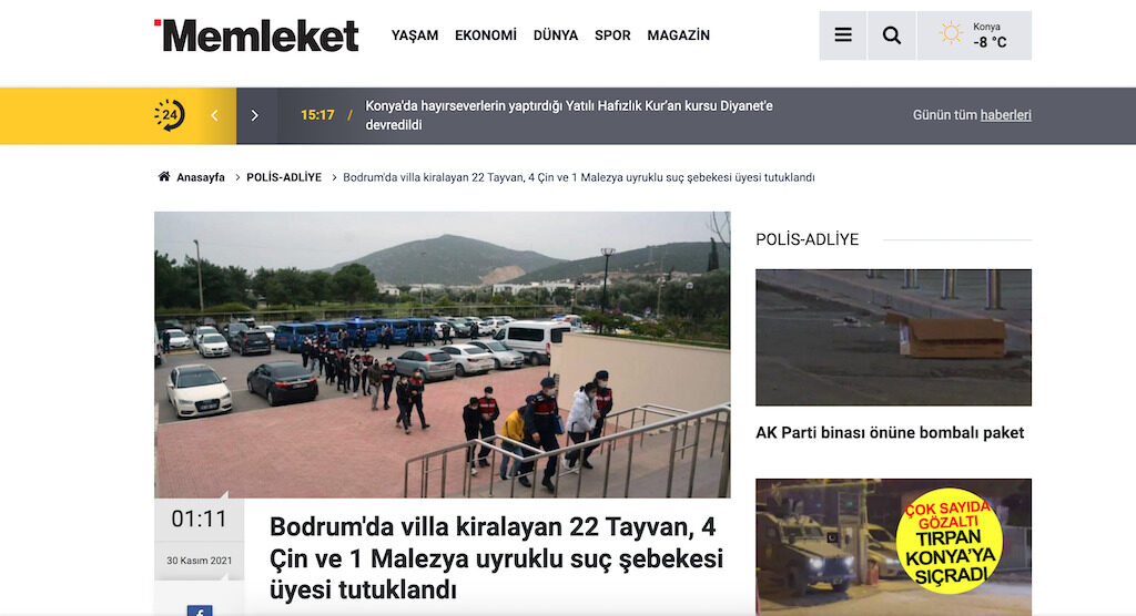 11月底台灣與土耳其警方合作,在土耳其知名旅遊勝地博德魯姆(Bodrum)一處別墅查獲台灣詐騙集團,共有22名台灣詐欺犯涉案被捕,目前土耳其還在進行後續偵辦。此次已是今年第四度破獲在土耳其設機房的台灣詐騙集團,此案中的成員多為台中人,進行人口販運與跨國電信詐騙,台中地檢署分案調查,與土耳其方溝通遣返事宜,此案多家土耳其媒體皆有報導。